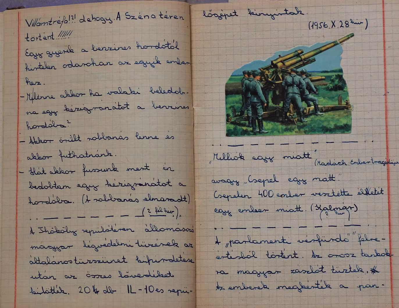 A napló hátuljára beragasztotta a másodikos olvasókönyv március 15-éről szóló olvasmányát, mellé pedig átírta annak szövegét, aktualizálva a saját október 23-i élményeivel és kiegészítve néhány további epizóddal: